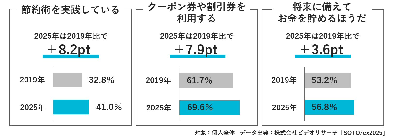 節約術の実践やクーポン利用、将来に備えた貯蓄意識などの「節約行動」は、いずれも2019年より高まっています。